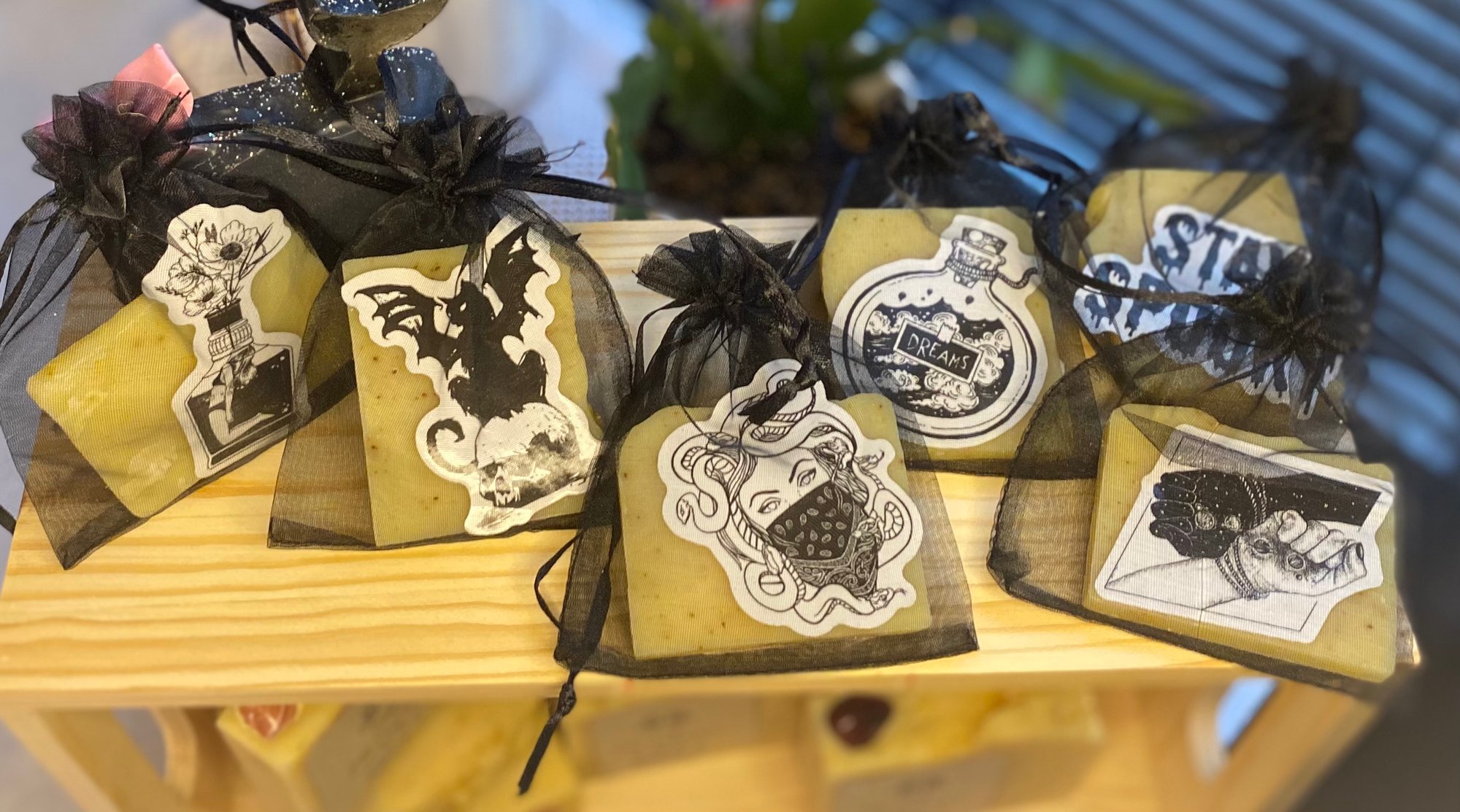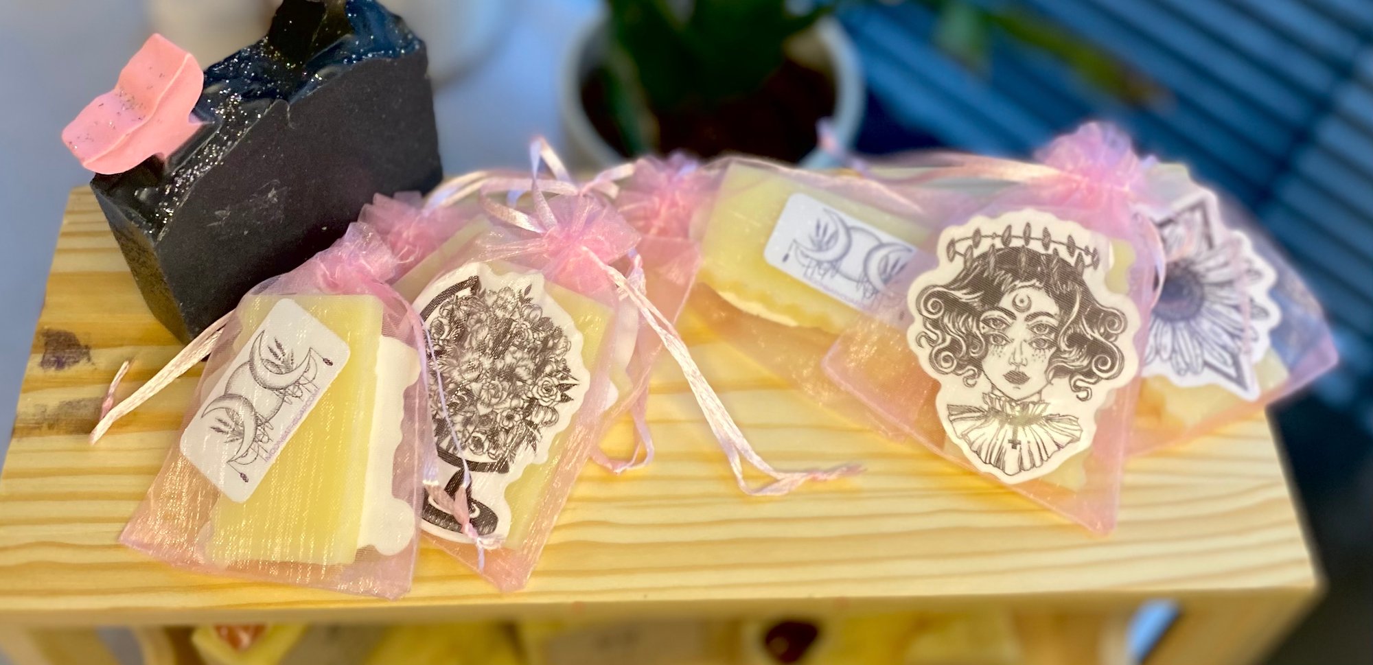 Each bag contains: one mesh bag, one holiday sticker, one Moonbathsoap.com sticker and one sample bar of soap